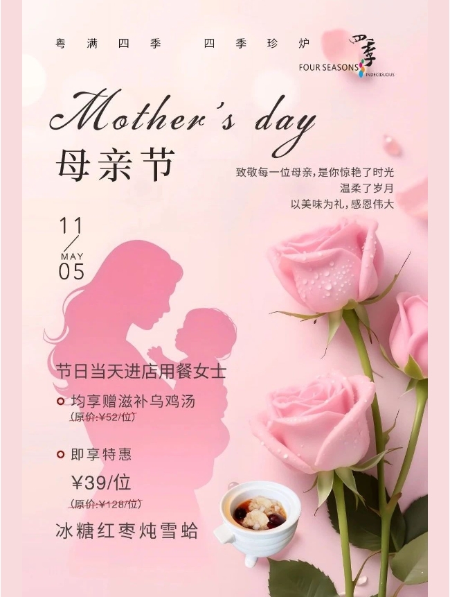 这个周日,母亲节翩然而至,四季荟餐厅满怀爱意,为您和母亲献上暖心盛宴! 冰糖红枣炖雪蛤,在母亲节当天惊喜特惠,软糯香甜的红枣,搭配细腻柔滑的雪蛤,每一口都是满满的滋养。